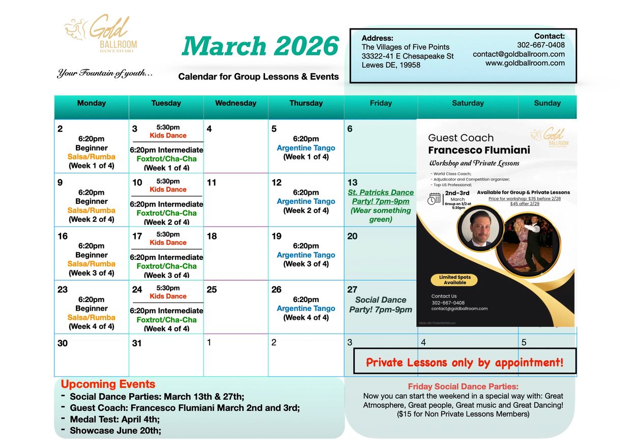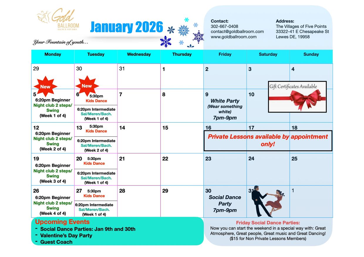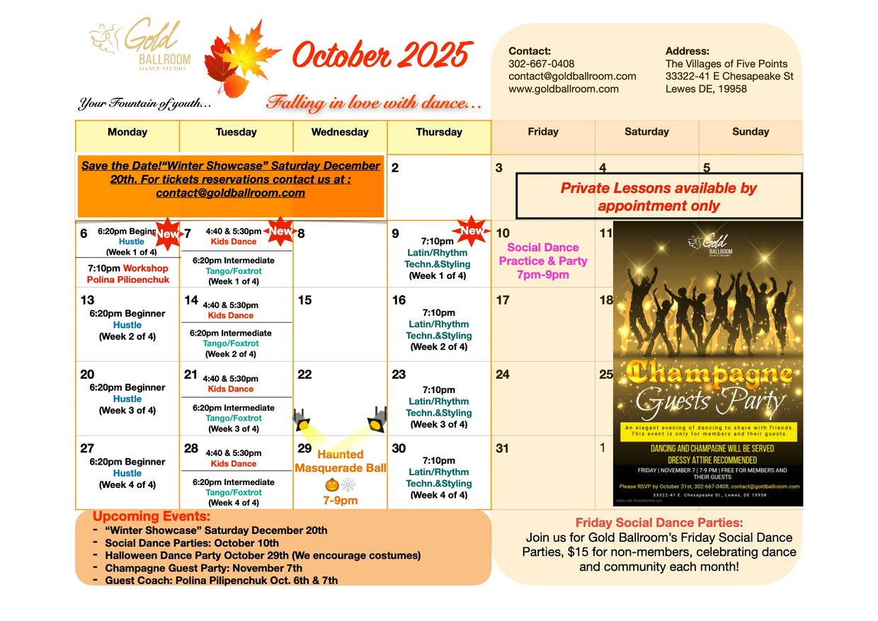 At Gold Ballroom, discover the magic of dance! Join our welcoming community for classes, private lessons, and exciting social events, perfect for all skill levels. Come learn, connect, and celebrate the joy of movement!